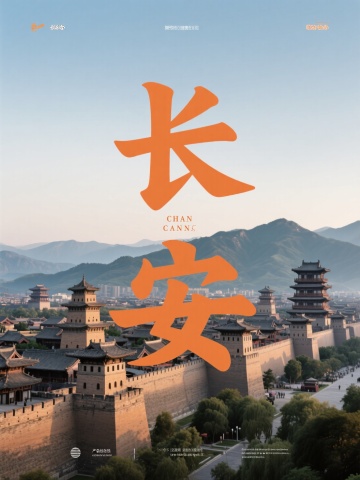 古城西安城墙上呈现气势磅礴的"西安"巨大的景观字,每个笔画由卷起翻滚的砖石组成,美丽的天空,树林远处隐约有一支考古队伍