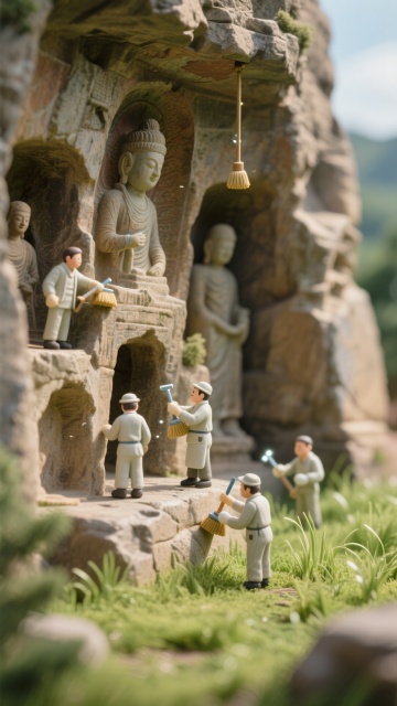 微缩艺术风的3D石刻佛窟,匠人细致清扫,浮雕佛像静谧庄严,中式古典感与神圣氛围交融。