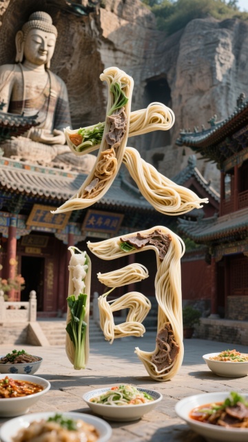 中式古典禅意场景,以3D浮雕风呈现“大同”二字,面条与食材巧妙构成文字,重拟物设计融合神圣感与体积感,传递节日美食文化。