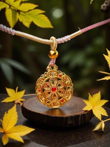 黄金吊坠产品为主体,在一块乌木上,周围放着很多金色枫叶,远处是热带雨林和树的粗支,背景模糊,整体氛围暗色神秘