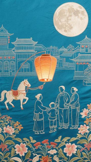 刺绣风插画,蓝底金线勾勒古典建筑与团圆人物,暖色灯笼与明月映衬温馨中秋夜,花丛点缀,尽显中式民族梦幻故事感。