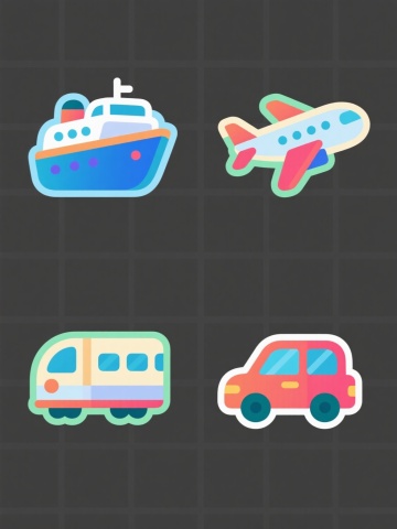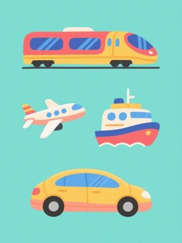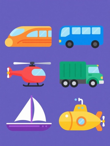 一组6个不同元素内容的系列素材集合,每个元素均采用扁平化插画风格,规整排布在纯色背景上,整体色彩变换且保持统一的色彩和谐度,每个元素都具有圆润的线条、简洁的形态、平滑的渐变过渡和清晰的高光表现,光影效果柔和,物体边缘清晰,无复杂细节,呈现出简洁明快、现代感十足的视觉氛围。元素内容分别为:1. 橙色流线型高速列车,车头圆润,车身有横向长窗;2. 蓝色双层巴士,车身方正,车窗排列整齐,车顶有天窗;3. 绿色货运卡车,车头宽大,车厢为封闭式,车轮较大;4. 红色直升机,机身流线型,有机翼和尾桨,驾驶舱透明;5. 紫色帆船,船体修长,有白色帆布帆,船帆呈三角形;6. 黄色潜水艇,艇身圆润,有观察窗和螺旋桨,顶部有潜望镜。所有元素大小一致,间距均匀,呈两行三列整齐排列。