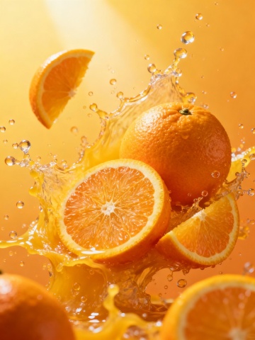 画面主体:一罐蓝色饮料悬在空中,位于画面中心,被透明的水包裹着,橙汁和桃子片在周围飞溅。 画面风格:逼真且具有活泼吸引力的广告宣传风格。 色彩搭配:以蓝色的饮料罐、白色的品牌名称、橙色的橙汁和粉色的桃子片为主,与蓝色天空白云背景形成鲜明对比。 光影效果:强烈的阳光从下方照射,使饮料罐和飞溅的汁液产生明亮的光影效果。 构图:从下往上拍摄,突出饮料罐和飞溅的元素,天空白云作为背景。 其他:饮料罐上印有切好的桃子标志清晰可见,飞溅的橙汁和桃子片营造出活泼诱人的氛围,吸引观众的注意力,让人产生想要品尝的欲望。画面丰富、清新