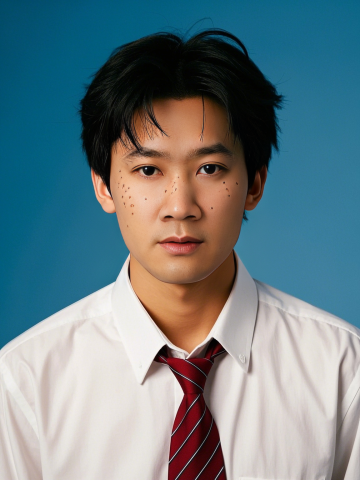 一个男生,美式复古证件照,干净的纯蓝色背景,衬衫,领带