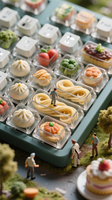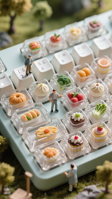 3D微缩艺术风,清新可爱的小人与美食在键盘上趣味互动,营造童话般的场景。