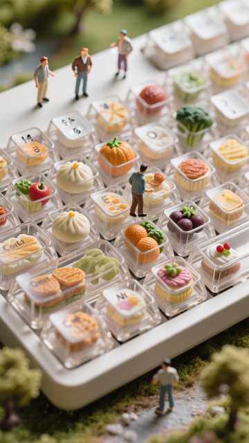 3D微缩艺术风,清新可爱趣味感,迷你人物与精致食物模型,营造童话般场景。