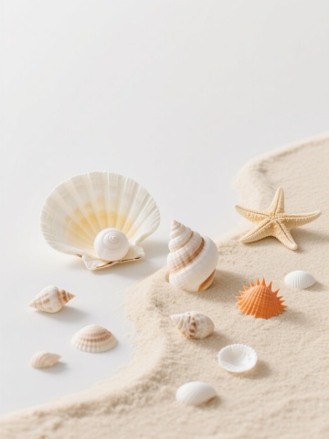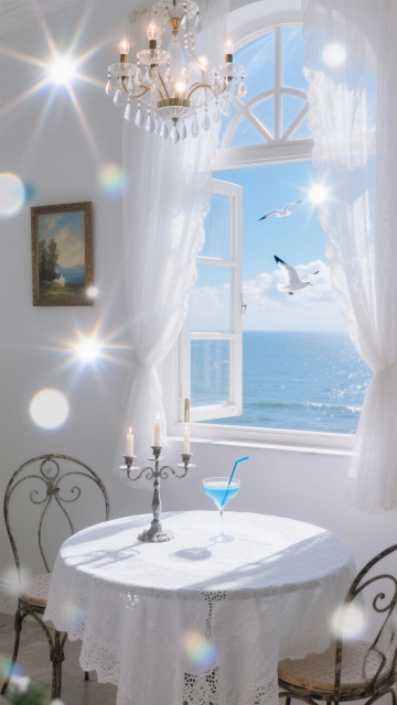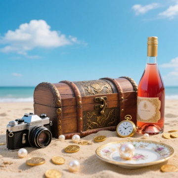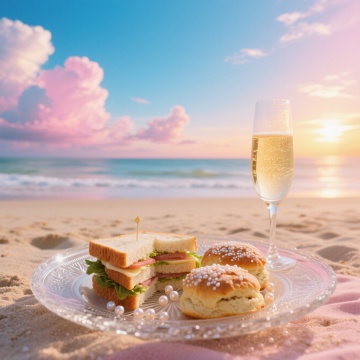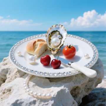 Retro photography style with grainy texture,Background is blue sky,white clouds,and sea.;On a white reef stone,there is a diamond-encrusted plate with bread and oysters,shimmering. A few red cherries and small tomatoes. Outside the plate,there are pearls and a shining white-handled dinner knife. Retro photography,with an oyster shell standing upright in the center of the plate,containing a sparkling white pearl
