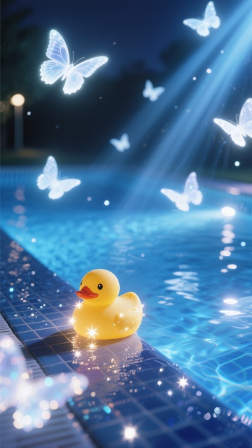 暗光氛围,蓝色氛围光,夜晚的泳池,小黄鸭玩具特写,若干只白色发光蝴蝶错落飞舞环绕