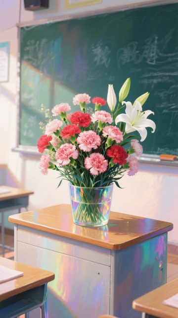全景俯拍视角,在一座被晨光温柔唤醒的百年老校舍三楼走廊尽头,一间微微敞开着木门的教室正悄然诉说着时光故事——褪色的墨绿色黑板上用白色粉笔写着数学公式和几句潦草的励志格言,黑板边缘还挂着泛黄的世界地图,阳光透过爬满常春藤的玻璃窗,在地面切割出菱形光斑,光斑中漂浮着细小的尘埃。二十张核桃木课桌呈整齐的四列排列,每张桌面上都有深浅不一的刻痕,其中一张靠窗的课桌上,压着半块橡皮、翻开的语文课本(第三十七页的《从百草园到三味书屋》被阳光照亮),以及用玻璃瓶装着的野雏菊。教室后方的黑板报上用彩色粉笔绘制着"新学期新希望"的主题画,角落的饮水机旁堆着几个空水桶,墙角的老式吊扇正缓慢转动,在天花板上投下旋转的阴影,空气中弥漫着粉笔灰、旧书本和淡淡消毒水混合的味道,色调以温暖的赭石色木质纹理为基底,点缀着苔藓绿黑板与天蓝色窗帘的清新对比。