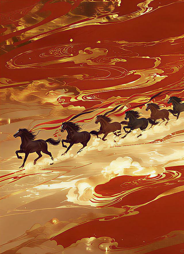极繁风格插画,岩画,岩彩,仰视视角,敦煌壁画风格神话场景插画,细节如下: 主体神兽插画: 形态:雪白神马(仰头),在画面中心偏下,周身环绕白焰状飘带(质感轻盈如云雾,有环境色点缀),脚踩火焰流(火焰流从上到下环绕画面,有金、红橙、绿、棕色点缀); 装饰:神马位于双层圆形法轮中央(内层法轮为深褐星空纹理,外层饰橙红宝相花纹样,边缘金纹勾边)。 背景与人物: 背景:通体为敦煌式卷草火焰纹,以橙、红、金为主色调,纹理呈漩涡状缠绕,夹杂细碎金星光斑; 飞天人物:3-4位身着飘逸汉服的飞天,衣袍为灰、蓝、紫等配色,姿态舒展环绕于火焰纹之间,衣袂与飘带随漩涡纹理流动,在画面上方。 风格与色彩: 风格:敦煌壁画重彩风格,融合岩彩肌理与传统神话元素,线条圆润卷曲,纹样繁复华丽; 色彩:主色调为橙、红、金(暖调火焰纹),搭配白、青蓝(神马)、灰紫(飞天),色彩浓郁厚重,带有斑驳的古画肌理质感。 构图: 纵向满版构图,神马与法轮居于画面中下部,火焰纹与飞天填充画面上部及四周,整体呈漩涡式动感布局,视觉层次丰富且氛围神秘瑰丽。详情