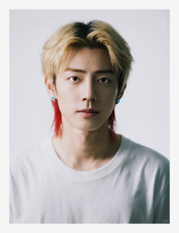 一个女生,狼尾短发,上半部分金色+下半部分嫣红色;金色眉毛;戴浅蓝色耳钉,穿白色T恤