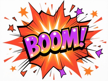 俯视视角,漫画风格特写,霓虹紫色与荧光黄色交织的"BOOM!"字样从破裂的漫画对话框中喷涌而出,字体棱角分明且带有动态速度线,黑色粗描边内嵌着闪烁的白色光点,背景是层层递进的橙红色爆炸波纹与飞溅的星形碎片,中心区域的强光形成放射状眩光效果,整体构图呈现强烈的向外扩张感,白色背景使所有元素如同从纸面弹出般充满张力,完美捕捉到惊喜瞬间的爆发力与视觉冲击。