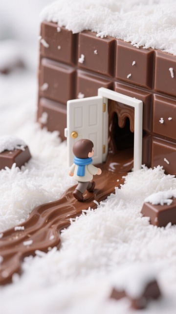 梦幻卡通风格,微缩巧克力屋,液态巧克力流淌,冬日童话场景。