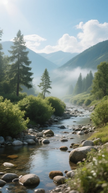 全景镜头,晨曦微露时分的山谷秘境,薄雾如轻纱般在翡翠色的草甸上流动,蜿蜒的银色溪流如时间的脉络穿行其间,两岸点缀着露珠闪烁的白色小花,远处靛青色的山峦轮廓在紫粉色的朝霞中若隐若现,水面倒影与实景交织成梦幻的双重世界,空气中弥漫着湿润的草木气息,光线柔和得如同被滤过一般,细节丰富的3D渲染质感中透着水彩画般的诗意朦胧,整体色调呈现出青绿色与玫瑰金的渐变融合,营造出神秘而又充满希望的黎明之境。