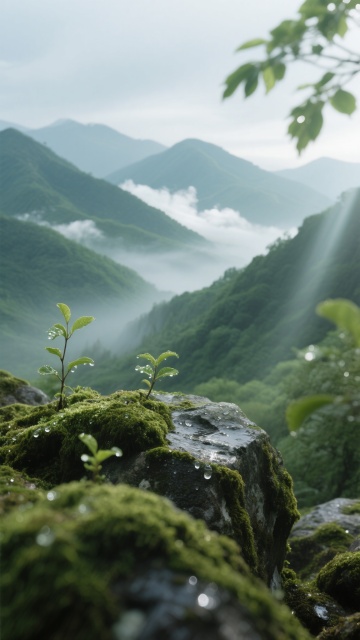 清晨或傍晚时分的山脉全景,连绵起伏的多层山峦呈现深浅不一的绿色,从近处茂密的墨绿色森林到远处被薄雾笼罩的淡绿色山峰,山间云雾缭绕如轻纱般飘荡在山谷间,一条蜿蜒的河流穿过山脚,阳光从云层间隙洒落形成柔和的光束,照亮部分山脊和河谷,天空湛蓝纯净点缀着几缕白色云朵,整体画面层次分明、色彩清新自然,营造出宁静悠远、生机勃勃的山水意境,具有高度写实的摄影质感,细节丰富的植被纹理和清晰的山体轮廓。