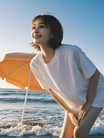 海边实景,清新文艺风,红背带与白T恤搭配,自然光线营造温馨氛围。
