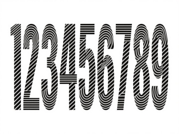 极简主义风格数字设计,白色背景,阿拉伯数字123456789按照顺序排列,每个数字由平行黑色线条构成,线条均匀分布,形成独特的条纹质感,数字形态保持原图中的几何美感和线条韵律,整体构图简洁平衡,具有现代设计感和视觉冲击力。