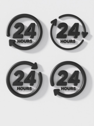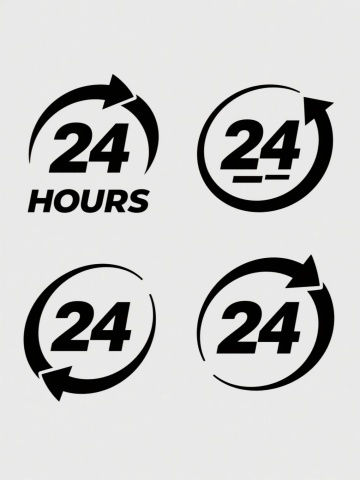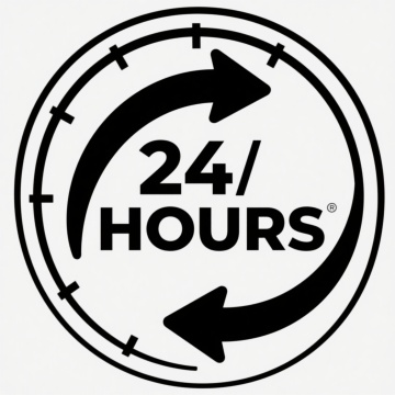 24 HOURS文字与顺时针箭头构成的圆形标志,采用扁平风格设计,黑色线条简洁流畅,白色背景纯净,箭头与环形跑道元素体现时间循环与持续服务,整体造型简约现代,信息传达清晰直观,符合24小时服务的品牌标识特征。