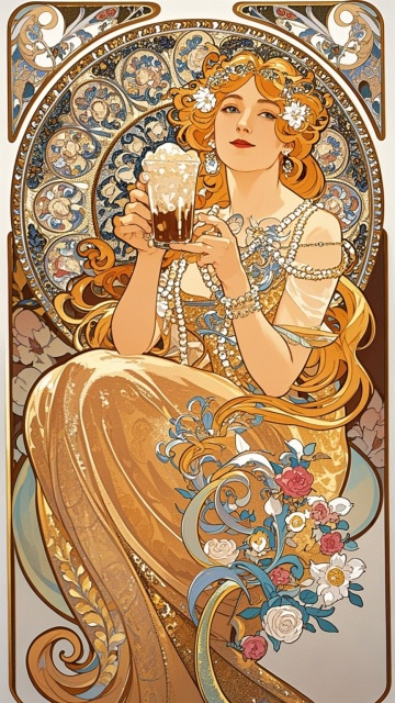 女神手里拿着奶茶坐在画面中间,极繁主义,穆夏插画风格,不要出现醒目的文字