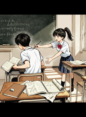 清新卡通风格,动漫风校园场景,少女轻拍男生肩头,阳光洒入教室,营造温馨互动氛围。