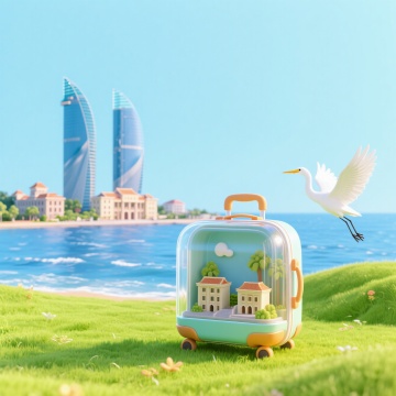清新3D风微缩艺术,行李箱内藏厦门小城,色彩斑斓,夏日度假氛围。