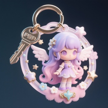 6. 45度角透视,穿着紫色魔法师长袍的小女孩,粉色长卷发自然垂落,头顶戴着尖顶魔法帽,帽檐别着黑色星星发夹,蓝色眼睛闪烁着神秘光芒,左手握着星星形状的魔法棒,右手抱着戴着巫师帽的仓鼠玩偶,周围漂浮着魔法阵图案的星星和水晶球造型的爱心,白色背景使魔法元素更加突出。