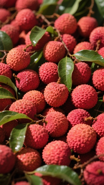 一堆新鲜饱满的荔枝,果实呈现鲜艳的红色,带有自然的纹理和光泽,夹杂着翠绿的荔枝叶,采用俯视角布局,光线从斜上方照射,形成明显的光影对比,突出果实的立体感和表面质感,整体构图紧密饱满,色彩明快鲜亮,充满丰收的喜悦氛围。