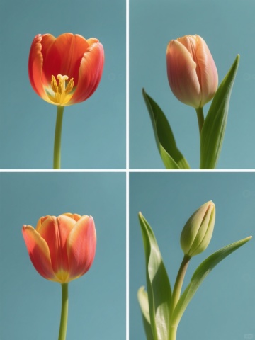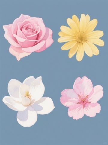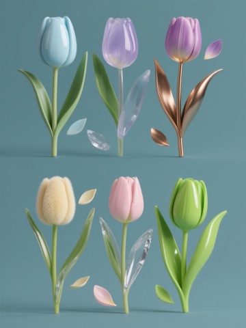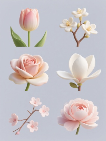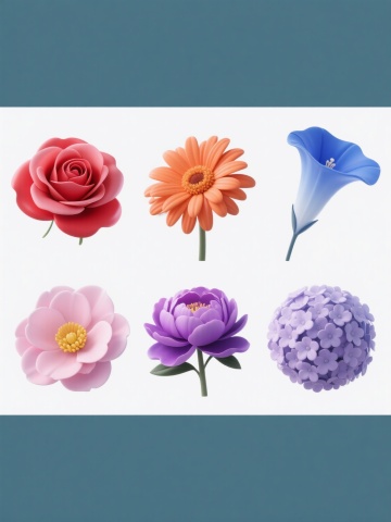 一张具有高设计感的花卉系列素材集合海报,采用与原图一致的超写实主义风格,以纯净的纯色为背景(非白色,变换整体色彩),画面中六个完全不同的花卉元素规整排布,保持原图的元素类目和视觉层级。每个花卉都具有极致细腻的3D质感,花瓣边缘光滑柔和,带有轻微的高光和自然阴影,花蕊细节清晰可见。从左到右、从上到下依次为:一朵粉色山茶花,花瓣层层叠叠,中心点缀着黄色花蕊;一朵红色玫瑰花,花型饱满,边缘微微卷曲;一朵橙色菊花,花瓣呈放射状排列,富有层次感;一朵蓝色牵牛花,呈漏斗状,花茎纤细;一朵紫色牡丹花,雍容华贵,花瓣宽厚;一朵淡紫色绣球花,由许多小花簇拥而成,球形花团紧密饱满。整体设计信息传达效率高,视觉层次分明,符合现代简约的设计美学,适合作为装饰素材使用。
