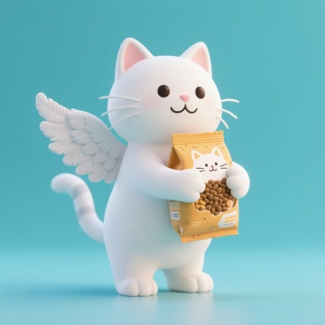 头身比1:1的小猫抱着猫粮眼睛闪亮四处张望