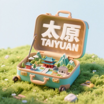 清新卡通3D风,微缩艺术展现太原美景,行李箱创意设计,尽显旅行乐趣。