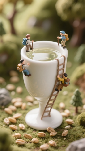 粘土风微缩艺术,卡通人物攀爬草莓山,梦幻超现实主义场景。