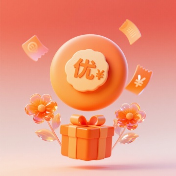 软3D风设计,橙色礼盒与花朵,营造喜庆氛围,优惠券飞舞,节日促销创意。