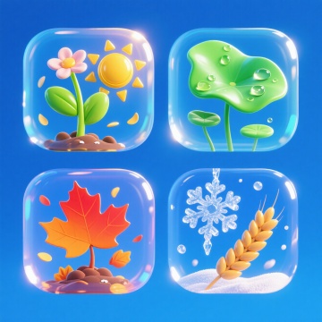4个Q版图形(元素独立区域):春元素、夏元素、秋元素、冬元素,宝蓝色背景