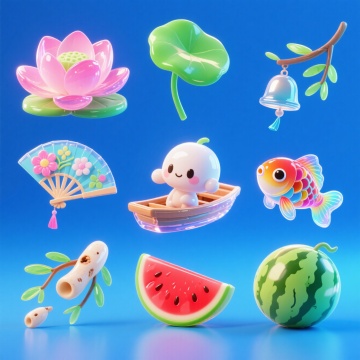 6个不同样式的3D卡通西瓜运动小人,每个西瓜小人都具有鲜艳的红色瓜瓤、深绿色带浅色条纹的瓜皮、黑色西瓜籽,以及圆润的红色小手脚,整体呈现Q版可爱造型。第一个西瓜小人戴着绿色墨镜在冲浪,脚下踩着绿色条纹冲浪板,周围有飞溅的水花;第二个西瓜小人在跑步,双臂前后摆动,表情充满活力;第三个西瓜小人在打篮球,双手持球准备投篮;第四个西瓜小人在游泳,戴着泳帽和泳镜,身体呈现划水姿势;第五个西瓜小人在骑自行车,双手扶着车把,双脚踩动踏板;第六个西瓜小人在做瑜伽,身体呈现平衡姿势。所有西瓜小人都有拟人化的微笑表情,表面带有晶莹的水珠质感,显得水润新鲜。它们排列在浅色背景上,分为上下两行对齐排列,每行3个,整体构图均衡,充满夏日运动的欢快氛围,具有清晰的视觉层级和信息传达效率,符合可爱活泼的设计感。
