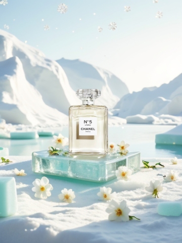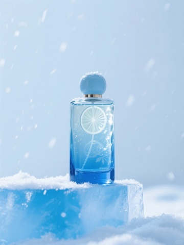 一瓶香水特写,背后冰蓝色香水瓶身折射着粼粼波光,轻喷瞬间,如同开启了一瓶冒着细密气泡的冰镇苏打水。前调的柑橘清爽迸发,中调茉莉的淡雅温柔如融化的香草雪糕,尾调雪松的木质香萦绕,仿佛将整个清凉夏日的惬意装进了香气里