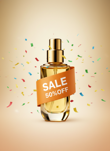 3D重拟物风格香水瓶,金属质感喷头,橙色促销带标注“SALE 50%OFF”,彩色纸屑飞舞,营造节日促销氛围。