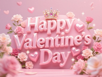 "七夕情人节快乐”3D英文大字,鲜花爱心皇冠装饰,粉嫩