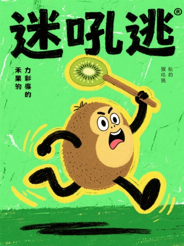 清新卡通风格,拟人化猕猴桃手持切片奔跑,插画风设计,噪点纹理增添趣味。