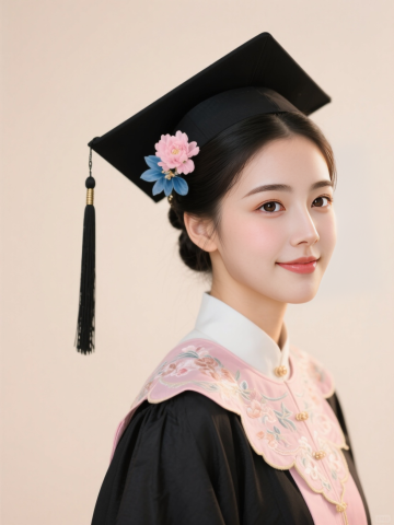 正面照,黑色古风垂挂髻,穿戴学士服学士帽,戴淡粉色刺绣云肩,学士帽旁边簪了粉蓝色的花,背景浅色,暖光