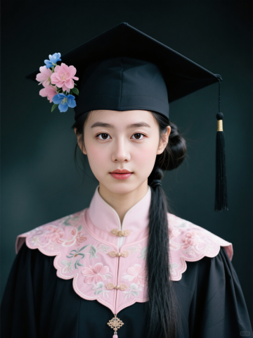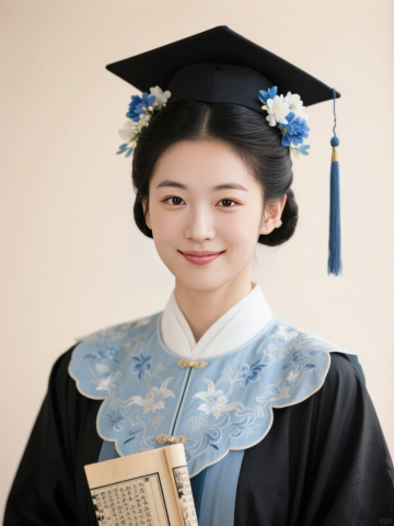 女生证件照,黑色学士袍,内衬是天青色汉服,鬓角和帽子上簪青色洋桔梗和青色玫瑰、白色小花,学士帽穗子,手执卷轴,领口复古花纹,黑灰色朦胧背景。