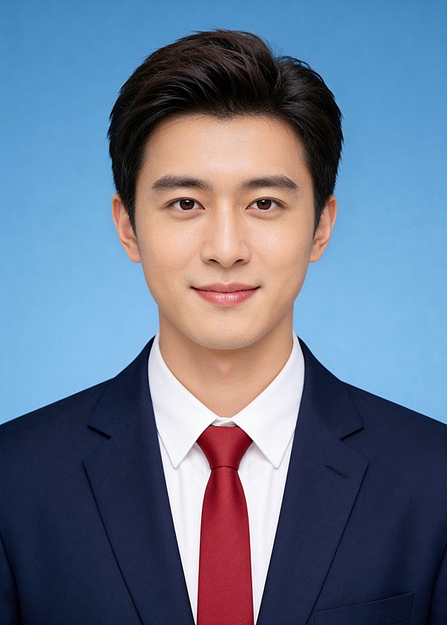 男生,白底证件照,蓝色西装,正面详情