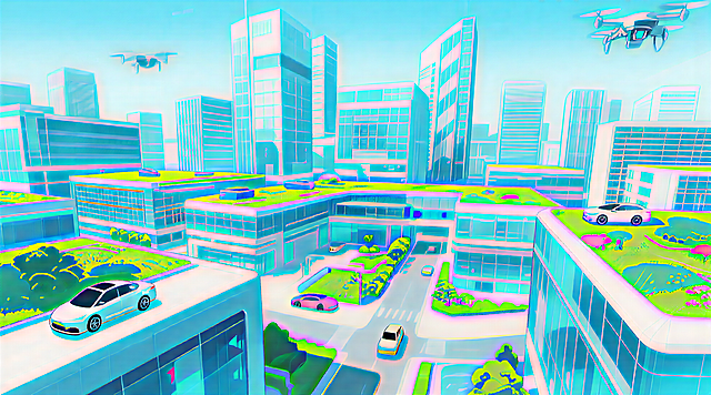 无人机在晴朗的天空中飞行,下方是现代化的城市景观,开阔通透的城市图景,动画风格,清新明亮的色彩,横版构图详情