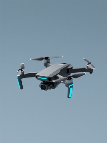 简约现代风格的无人机产品图片,单一无人机元素居中规整排布,机身以深灰黑色为主色调,配备蓝色装饰性灯带,四旋翼结构,底部搭载摄像头,整体造型简洁流畅,具有科技感,纯色背景(与原图背景色一致),无任何文字、logo或水印,突出无人机的形态设计和细节。