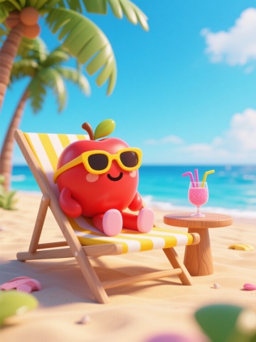 清新软3D风,简约卡通设计,夏日海滩场景,悠闲度假氛围。
