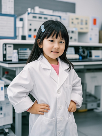 科技感实验室中,小女孩身着白大褂,可爱清新,轻拟物风设计,展现未来科学家的萌态。