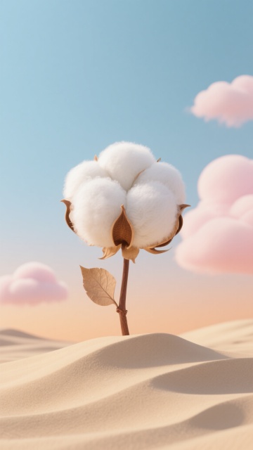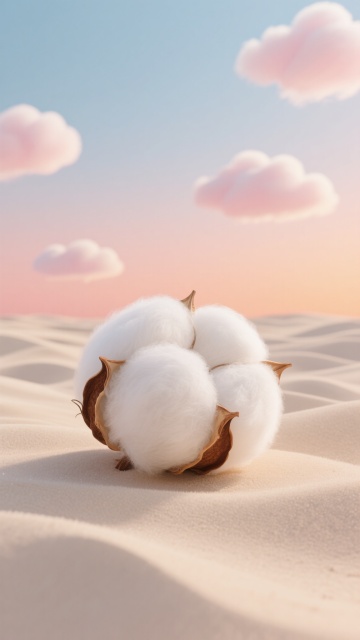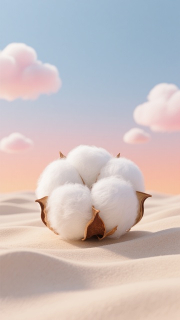 超写实3D渲染风格,一颗饱满洁白的棉花团静卧于起伏如波浪的浅米色柔软沙地之上,棉花纤维呈现出蓬松细腻的质感,底部带有干枯的棕色棉铃外壳。背景是渐变的天空,从上至下由清澈的淡蓝色过渡到温暖的粉橙色,点缀着几朵形态圆润、边缘柔和的粉白色云朵,整体光影柔和,营造出宁静、治愈、温暖的氛围,画面构图简洁,主体突出,色调和谐统一。