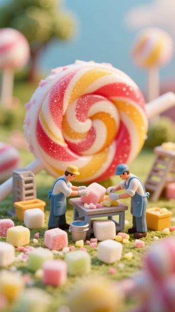 清新卡通风格,微缩艺术展现工人在西瓜上作业,趣味盎然。