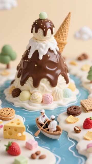 粘土风微缩艺术,卡通人物攀爬草莓山,梦幻超现实主义场景。