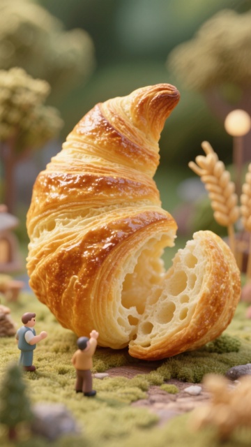 梦幻卡通风格,微缩艺术展现巨大 croissant,人物互动增添趣味。