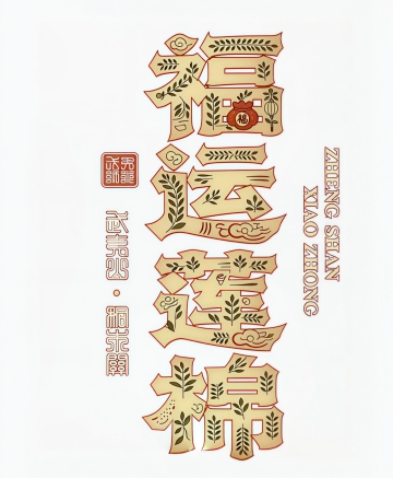 鎏金浮雕字体,融合大字风与国潮元素,中式复古奢华感十足,红印点缀,寓意新年财运亨通。